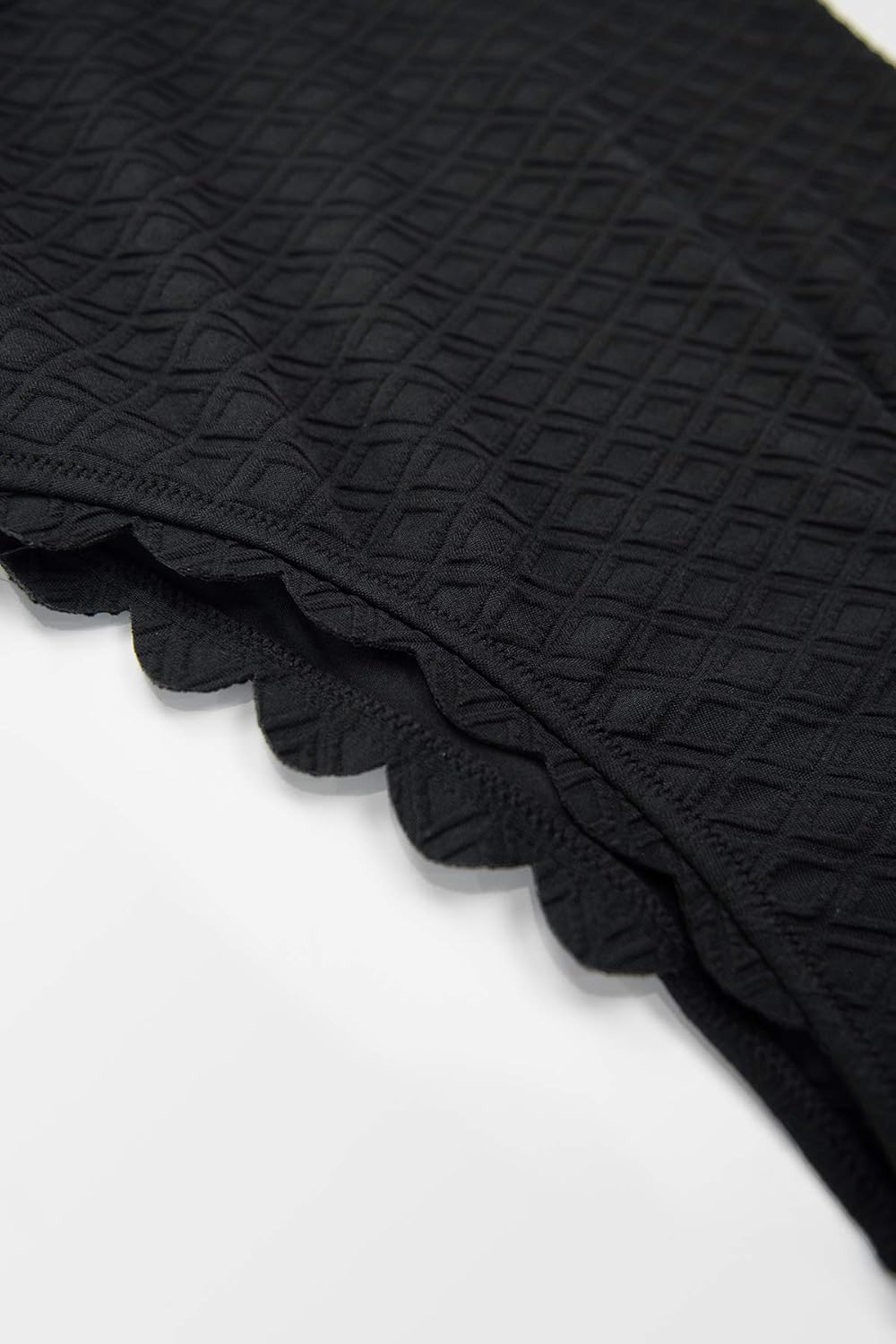 Special Fabric: 90%Polyester, 10%Spandex Imported Hook and Eye closure Regular Wash Design: Black Knotted Scalloped One Piece Swimsuit. Scalloped Trim Detailing Along the Neckline and Along the Leg Opening. The Cutout Design Adds a Little Flirtiness to This Classic Swimsuit Style. About Cup Style: Removable Pads Garment Care: Regular Wash. Recommend with Cold Water. Do not Use Bleach. Do not Tumble Dry.