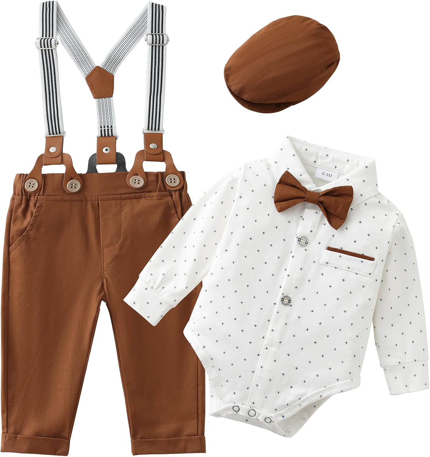 ❤Size: Suitable for baby boy clothes 0-3 months, baby boy suit 3-6 months, baby boy gentleman clothes 6-12 months, baby boy outfits 12-18 months. ❤Package include: 1pc long sleeve romper + 1pc bowtie + 1pc Suspender Pants + 1pc beret hat Show more