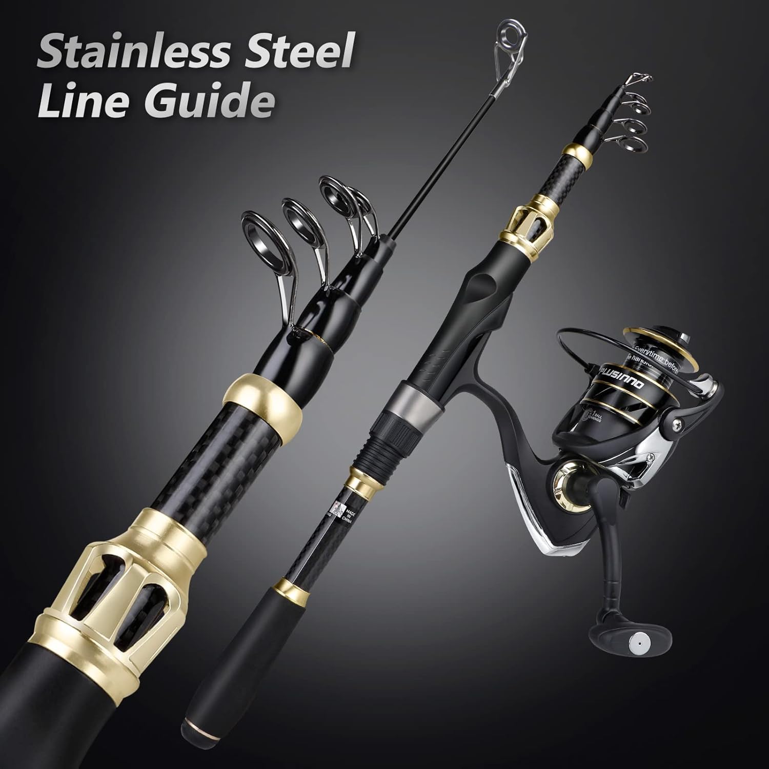 About this item 【Best Value Fishing Kit】- It's an all-in-one fishing rod with fishing line and tackle box including a selection of crankbaits, float bobbers, jig heads, soft lures, swivels and sinkers suited to a range of different fishing situations. A carry bag is also offered 【SENSITIVE & STRONG】PLUSINNO fishing rod blanks. All Elite Hunter Select fishing rods are constructed with IM6 Carbon matrix technology blanks giving each casting rod and spinning rod incredible performance, sensitivity and power. carbon split grip and full grip using a Non-slip EVA & Cork Handle, is made to deliver a premium rod at a greater value than the competition. 【Super Smooth Power】Stainless steel guides with Ceramic inserts makes it more smooth and durable, avoids line sticking into the guides, minimizes friction while also enhancing sensitivity by transferring vibrations from the line through the guide to the rod and to your hand. 【DOUBLE LOCKING REEL SEAT】 - Sturdy plastic reel seat with double locking structure is easy to assemble and disassemble, even kids can do it without any problem. Cushioned hood keeps your reel tightly in place and won't loosen when traveling long distances on choppy water. 【Portable and Easy to Carry】- Plusinno Portable Telescopic Fishing Rod features a collapsible design which makes it just portable enough to carry along with you. A carry bag also makes it easy to carry the pole and all the other accessories and protects it from getting damaged. It's the best gift to send father, son, husband, fiancé, boyfriend for the upcoming Christmas.