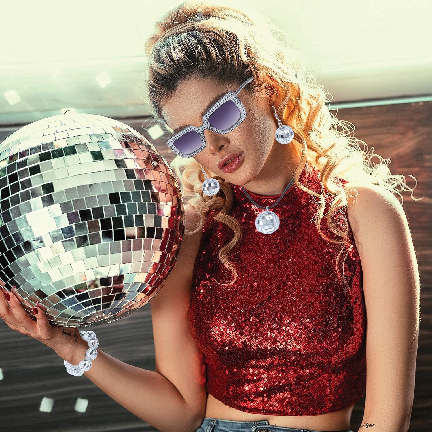 ? Disco Costume Accessory: You will get 1 pair of disco ball earrings, 1 piece of disco ball necklace and 1 piece of disco ball bracelet, 1 pair of black framed sunglasses and 1 piece of bling headband, 5 pieces in total ,which can be added to your 70's Disco costume ? Two-Tone Headband Design: Our disco headband adopts an adjustable two-tone design, one side is colored and the other side is silver. You only need to gently flick the small sequins with your hands to complete the color switching. ? 2 Colors Bling Headband: Made of polyester, this headband is soft, lightweight and easy to wash. Decorated in 2 different colors, you can see silver color from front view and rainbow color from the back, both sides can be used, will make you look fresh and more attractive. With adjustable ribbon design, headband suit most adult and kids' head and can be applied in holidays, weddings and many other joyous occasions. black sunglasses with rhinestones plated in the frame are delicate and cool. ? Disco Style: A fun favor at party, these accessories show a 60's and 70's style, a fun favor for Christmas parties, summer events, everyday wear, birthday party, retro themed costume, music festivals, disco costume, festivals, stage performance, clubs and other themed events ? Nice gift: They are nice gift for your girlfriend, mom, sisters, friends and other female relatives as birthday, Christmas, New Year and other holiday gifts