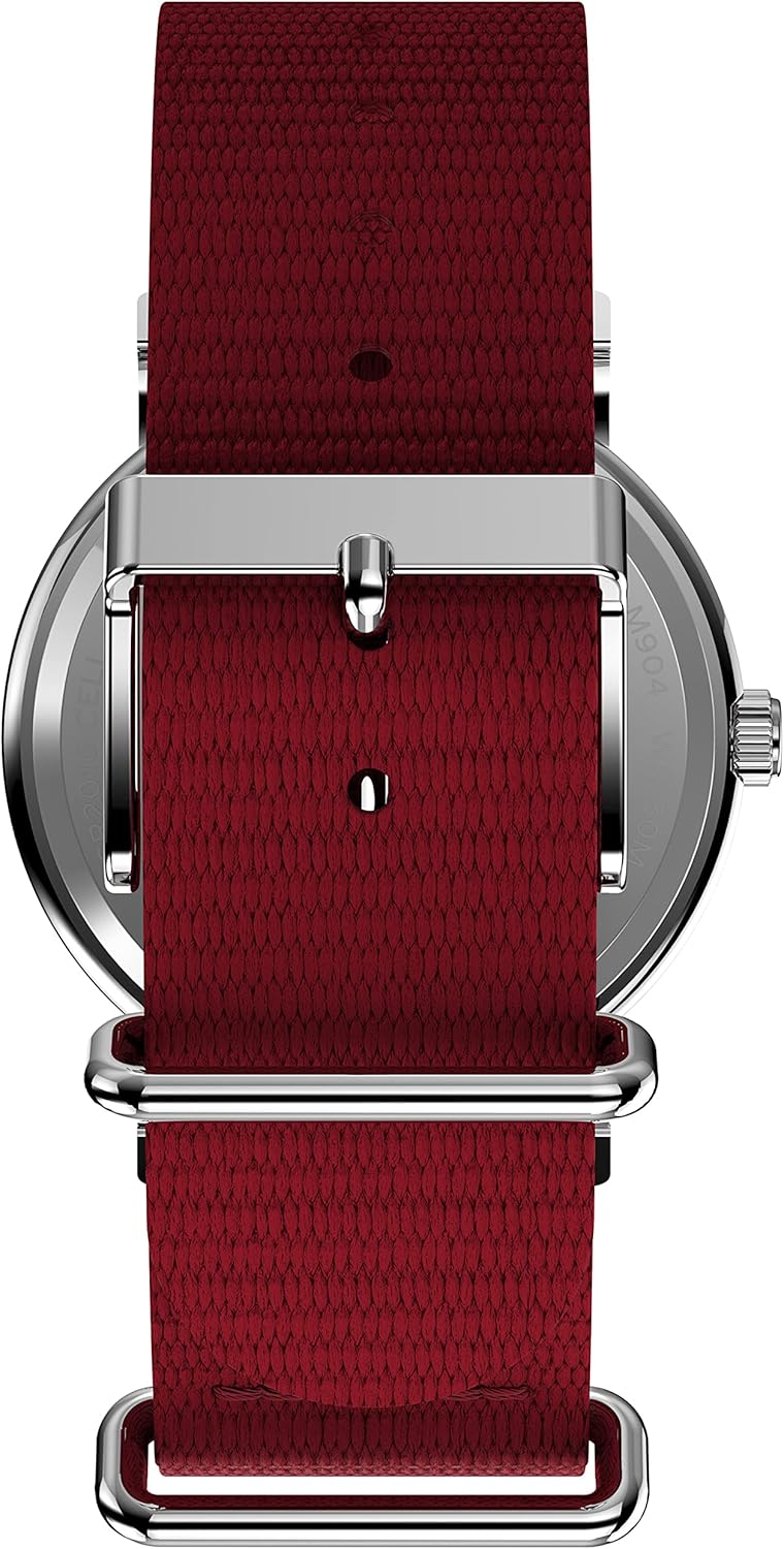 Imported Adjustable red 20mm fabric slip-thru strap fits up to 7.5-inch wrist circumference White dial with full Arabic numerals featuring Coca-Cola 1971 Unity artwork Silver-tone 38mm brass case with mineral glass crystal Indiglo light-up watch dial Water resistant to 30m (100ft): in general, withstands splashes or brief immersion in water, but not suitable for swimming or bathing