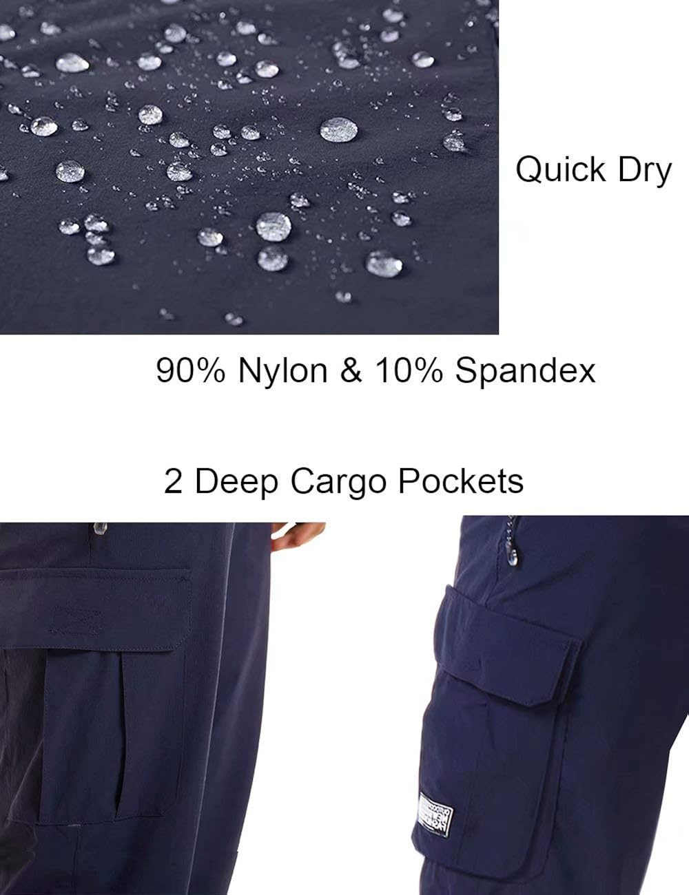Spandex,Nylon Zipper closure [Fabric] 90% Nylon and 10% Spandex; Quick-Drying, Stretch and Breathable. [Quick Dry] The nylon fabric is quick dry and offers superior function with moisture wicking technology that will keep you two degrees cooler. [5 Pockets] There are 5 pockets in this Capri pants, including 2 zipper side pockets, 2 deep cargo pockets and 1 zipper back pocket. [More Comfortable] Don't worry about feeling restricted, the partial elastic at waist will provide more comfortable. And the below knee shorts are athletic fit. [Perfect For] The quick dry cropped pants are perfect as hiking, running, camping, jogging , fishing, gym, casual shorts or work shorts.