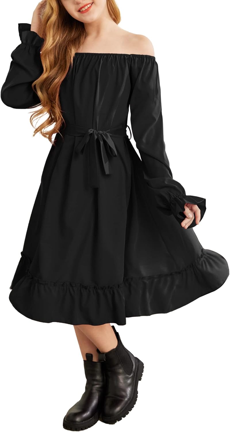 Arshiner Girls Long Sleeve Dress Holiday Party Casual Ruffle Flowy Swing Midi Dresses 5-14 Years