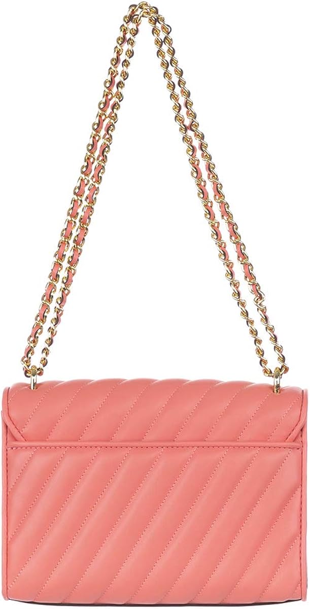 Made of PVC Leather, Flap with push lock closure with logo front, Silhouette is based on 5'9 inch model, 12 inch L handles, 21 inch L strap, Front and back open pockets, Pushlock closure. SV or Gold-tone exterior hardware, One snap slip pocket, One interior zip pocket, one center zip pocket and one front slip pocket, One open large compartment. Body: leather, Lining: polyester, Adjustable chain and leather shoulder strap with 25.5 drop. Measurements: Length: 9 x Height: 6.5 x Width: 3 Inches. Comes with original tags.