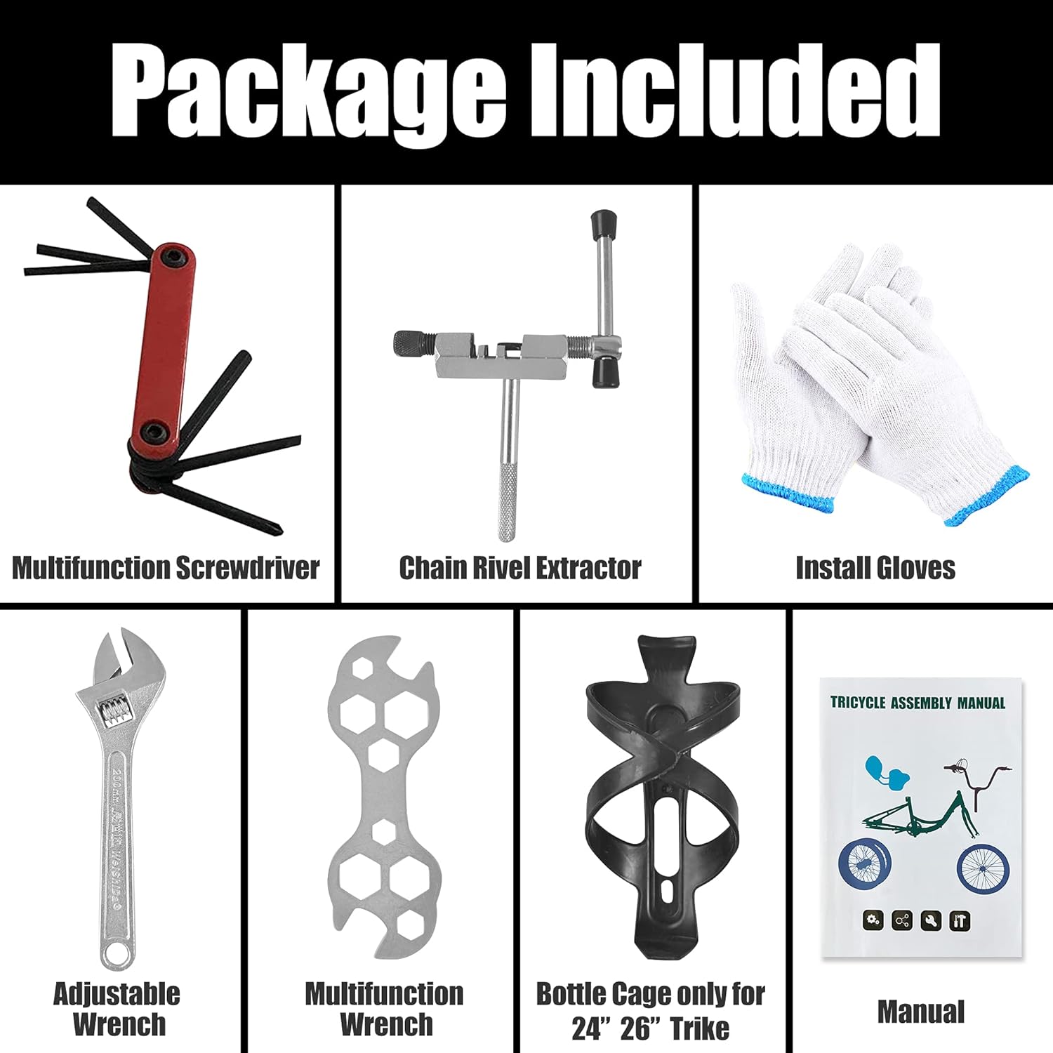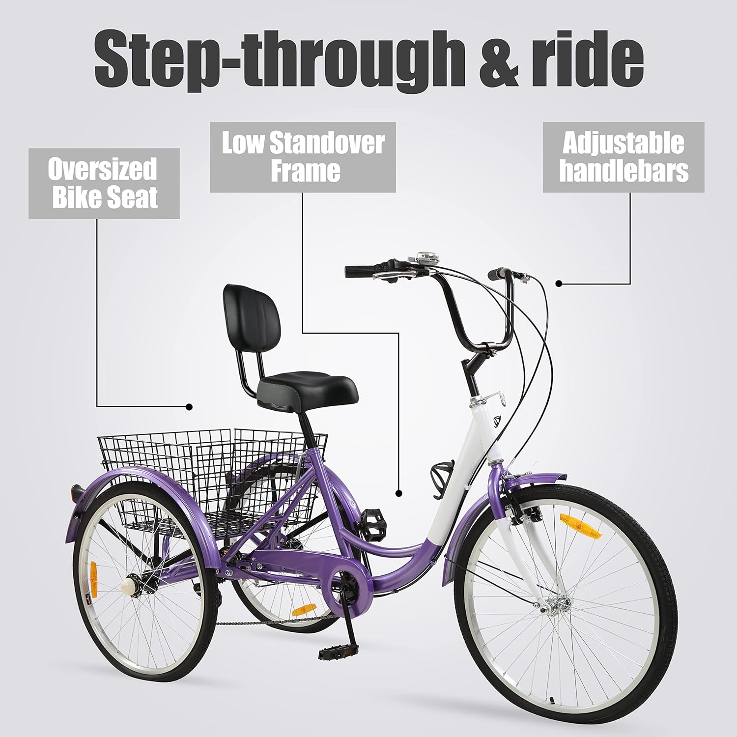 About this item Sturdy Balanced Structure: Ey adult trike bikes take advantages of high-grade steel bike body and alloy rims for solidness and durablity, 3-wheel triangle structure for better stability, low step-through design for friendly ride on with 350 lbs load capacity Comfort Bike Seat: Ergonomic & oversized design makes riding more comfortable with soft cusion for great shock-absorption, dual-bar backrest support, and adjustable height. Dimension: 9.5"(L) x 11.5"(W) Large Cargo Basket: Ey adult tricycle comes with a large rear basket making it convenient to carry daily grocery or your pets. Load weight up to 50 lbs. Dimension: 22"(L)x18"(W)x12"(D) Easy Up Hills: 7-speed Shimano derailleur drivetrain makes it easier and less effort to ride on hills or other terrains with front and rear fenders keeping your clothing and the trike bike clean What You Get: Ey Adult Tricycle 3 Wheel Bike (user manual, installation tools, water bottle holder, gloves and a gift item), worry-free One-year Warranty and friendly customer service. Replacement parts are offered at no charge. If you're not satified - FOR WHATEVER REASON - we’ll replace it or give you your money back. Buy with confidence!