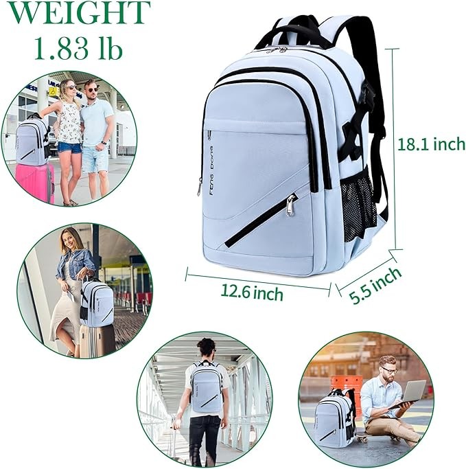 ★Large & Multipurpose Pockets★External dimensions: 18.11"H x 12.6"L x 8.3"W; The main compartment has roomy interior, it is not only able to accommodate most popular 17.3" laptop, but also can hold tech electronics and daily necessities easily, and three generous exterior front pockets can store essential accessories very well. ★Fashionable & Convenient Accessories★This stylish daypack set-in external Micro-USB port and 3.5mm headphone port, in order to offer you a more creative way to charge your electronic device and make a more convenient use experience. And the headphone interface frees your hands when enjoying audios, music, etc.Meanwhile, please note that this backpack doesn't include a power bank. ★Practical Design★The chest strap with a whistle buckle & luggage Strap design help you lock your backpack in place securely. The side elastic net pockets are convenient for holding umbrellas or water bottles. All-match design suit for school, college, business, travel, camping, hiking and other daily use. ★Superior Quality & Premium Craftsmanship★Made of heavy duty water resistant Oxford fabric and durable metal zippers, protects your device from light rain and accidental spills (Long time soaking is NOT recommended). Sturdy edge lining adds additional protection around the edges. Ergonomics top handle for a long time carry. ★Comfy System:Soft multi-panel ventilated padding makes maximum back air flow and support. Breathable and adjustable shoulder straps relieve the stress of shoulder. If you have any questions, please don't hesitate to contact us.
